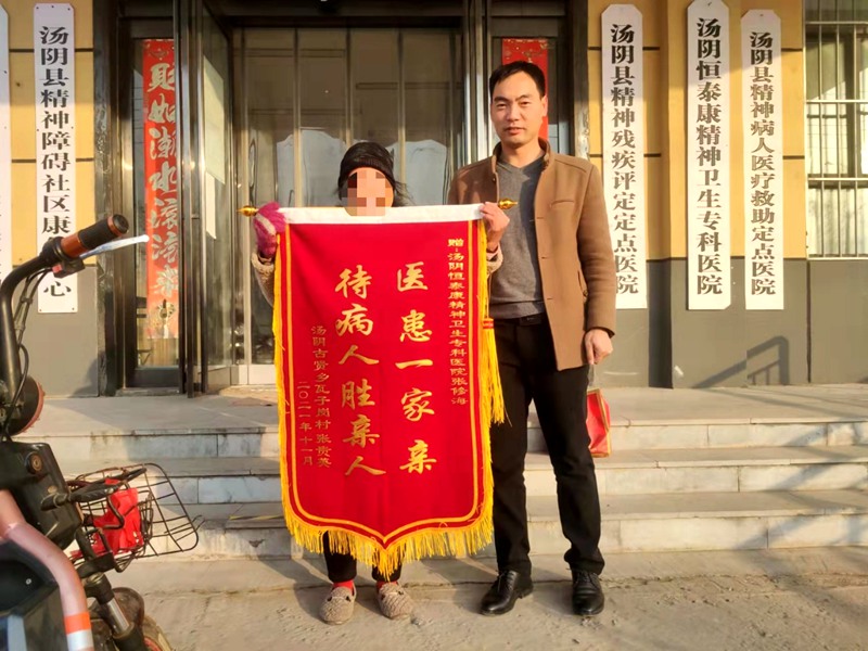 永州患者劉*娟,女,27歲,總病程10年余?;颊呖摁[無常,傻笑伴外跑10余年,眠差害怕。曾多次到株洲等地醫(yī)院住院治療過,但一直療效不佳。聽說寧遠(yuǎn)澍康醫(yī)院醫(yī)護(hù)人員對(duì)病人好,曾來醫(yī)院咨詢過,但當(dāng)時(shí)由于沒有床位,故推薦其去其它醫(yī)院,其母親聲稱愿意等我院有床位了再送來。于2021年11月7日開始在我院住院治療。經(jīng)過全院醫(yī)護(hù)人員的關(guān)心及藥物的治療,情況明顯好轉(zhuǎn)。其家里對(duì)其康復(fù)情況很關(guān)心,多次通過視頻進(jìn)行探視患者情況變化,對(duì)寧遠(yuǎn)澍康醫(yī)院的服務(wù)態(tài)度和醫(yī)療質(zhì)量很滿意!11月22日來醫(yī)院給患者送東西時(shí),專來送醫(yī)院一面錦旗,表示感謝。